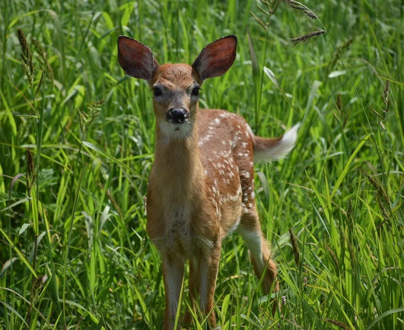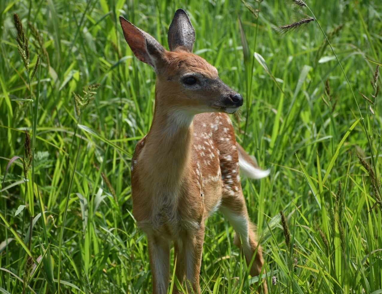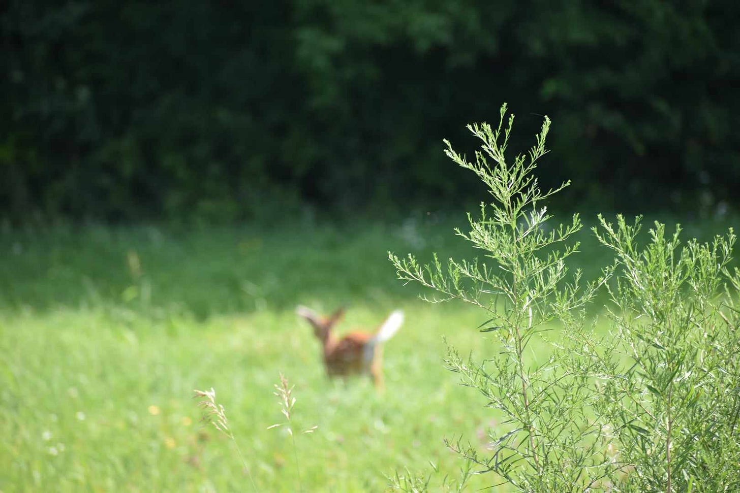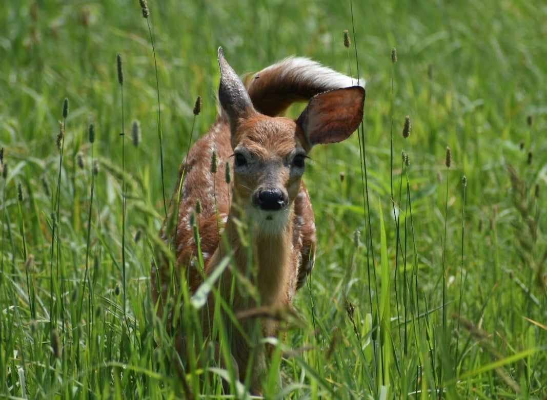 The surefooted little one turned as it so beautifully and effortlessly leaped through the grass in the meadow toward the forest.